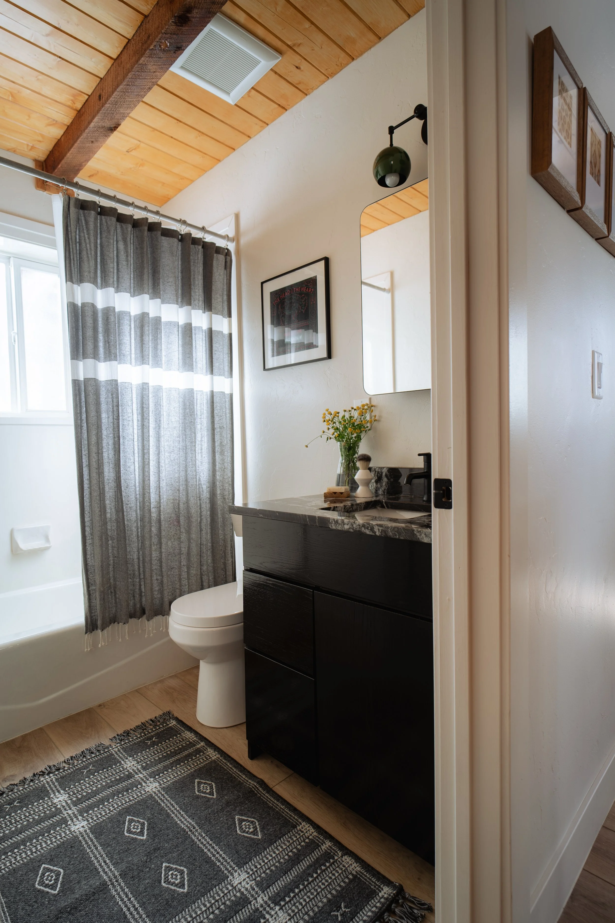 This modern cabin remodel exudes a moody and sophisticated atmosphere. Natural materials such as wood and stone are combined with luxe touches to create a warm and inviting space that seamlessly blends old and new. The cabin's carefully curated design elements come together to create a serene and stylish escape from the hustle and bustle of everyday life.